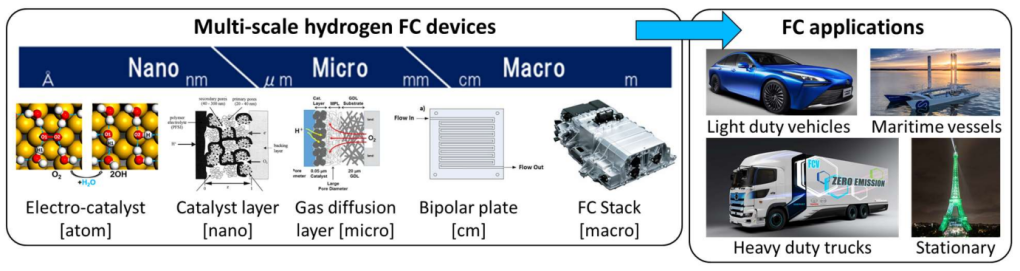 In view of the above, the automotive industry urgently needs to accelerate the introduction of alternative (FC driven) powertrains for electrified vehicles. Hydrogen-powered FCs are carbon-free power options for both mobile and stationary applications; however, they currently lack power density, efficiency and durability for widespread use. Such requirements for efficient FC devices lead to an inevitable demand for an innovative integrated cross-cutting research programme for rapid development. This is the key objective of BLESSED. The fact that FC devices are Multi-Scale (MS) systems introduces unique challenges to their analysis & optimisation which have generally limited the pace of engineering development. Indeed, they comprise many concurrent physico-chemical phenomena at different length scales, such as catalytically-assisted electro chemical reactions among molecules at nm-scale, transport of protons & gases at micro-scale and gas flows at cm-scales. For an efficient energy conversion, optimal synergy of phenomena occurring at all scales in a FC is needed along with their understanding by future researchers/engineers. BLESSED proposes to build methodological links of MS problems for integrating research findings from all these phenomena and improving industrial applications. BLESSED will address challenges outlined by the Green Deal for the transportation sector, with direct implication in four of the seven policy areas of the Green Deal, namely clean energy, sustainable industry, sustainable mobility and eliminating pollution. This is why the consortium brings together world-class academic expertise on simulations of quantum mechanics, electrochemistry, Molecular Dynamics (MD), chemically reacting flows, Computational Fluid Dynamics (CFD)-based analysis and optimisation (incl. adjoint methods and Evolutionary Algorithms (EAs)), and Machine Learning (ML), with industrial developers, to revolutionise the design process of next generation PEMFC devices.