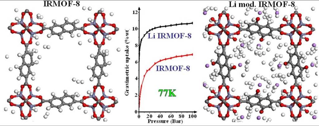 Our 2nd strategy is the functionalization of the framework’s organic part. This procedure is experimentally more feasible and gives the same impressive results like the 1st. In the figure above it is visible even with the eye the increasing of the absorbed hydrogen in the functionalized MOF.