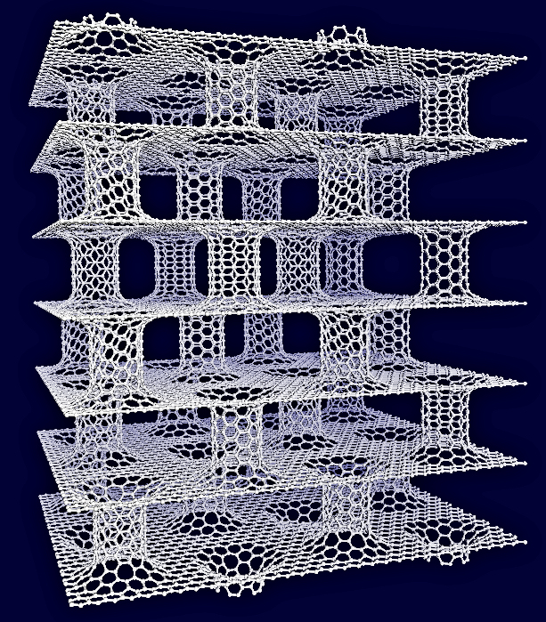 Having in mind carbon’s superior structural stability, low–weight and ease of processing, we aimed to design a carbon–based material with tunable pores and high gravimetric and volumetric H2 storage capacity. The objective was fulfilled by combining two carbon allotropes, Graphene sheets and CNTs, to construct an entirely novel material, Pillared Graphene. In this architecture, we can tune the pores at will, thus making the material ideal for several applications including hydrogen storage.
