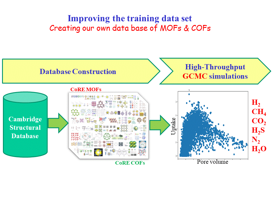 In order to produce data for training our ML algorithm we performed High-Throughput GCMC simulations in the CoRE-MOF and CoRE-COF [1] data bases for many different gases in various thermodynamic conditions (H2, CH4, CO2, H2S, N2, H2O).
