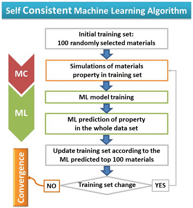 A novel training algorithm based on “Self-Consistency” (SC) replaced the standard procedure of linearly increasing of the TS (100, 200, 300, …). Our SC-ML methodology was tested in 5.000 experimentally made MOFs for investigating the storage of various gases (H2, CH4, CO2, H2S, H2O). For all gases examined, the use of both descriptors instead of building blocks leads to significantly more accurate predictions, while the number of MOFs needed for the training of the ML algorithm in order to achieve a specified accuracy can be reduced by an order of magnitude.