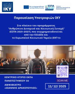 Σας προσκαλούμε σε ημερίδα παρουσίασης των προγραμμάτων υποτροφιών του ΙΚΥ η οποία θα πραγματοποιηθεί στην Αθήνα, στο Κεντρικό κτήριο του ΕΚΠΑ (Πανεπιστημίου 30), στο αμφιθέατρο «Ιωάννης Δρακόπουλος», την Πέμπτη 11 Δεκεμβρίου 2025 και ώρα 10.00 π.μ. Η ημερίδα θα εστιάσει κυρίως στα προγράμματα που συγχρηματοδοτούνται από την Ελλάδα και το Ευρωπαϊκό Κοινωνικό Ταμείο (ΕΚΤ+) στο πλαίσιο του προγράμματος “Ανθρώπινο Δυναμικό και Κοινωνική Συνοχή” (ΕΣΠΑ 2021–2027), και ειδικότερα: